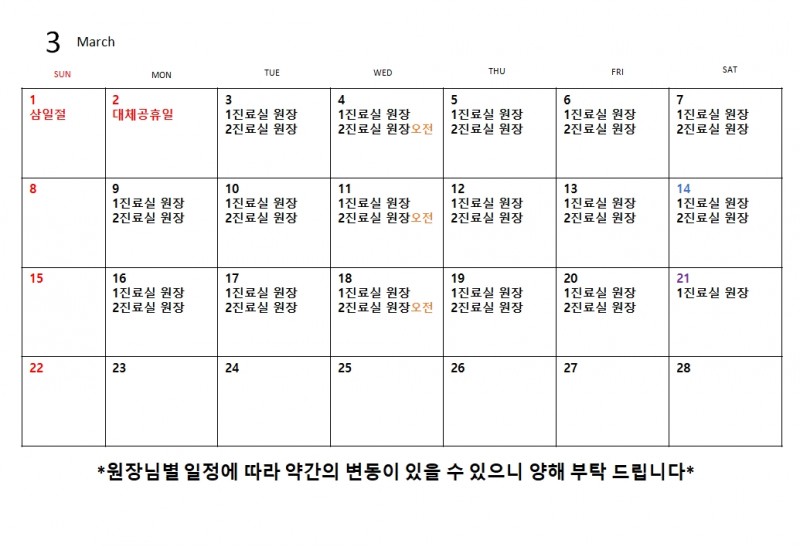 26년 3월 원장님 스케줄입니다.